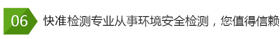 快準環境檢測公司技術力量雄厚,有一套完整的檢測服務流程,公司注重服務質量, 公司嚴把質量關向社會承諾:檢測公正、科學、高效、準確!空氣檢測、水質檢 測、土壤固廢檢測、輻射放射檢測、噪聲振動檢測、環保認證檢測、裝修材料 檢測就找山東快準環境檢測技術有限公司!
